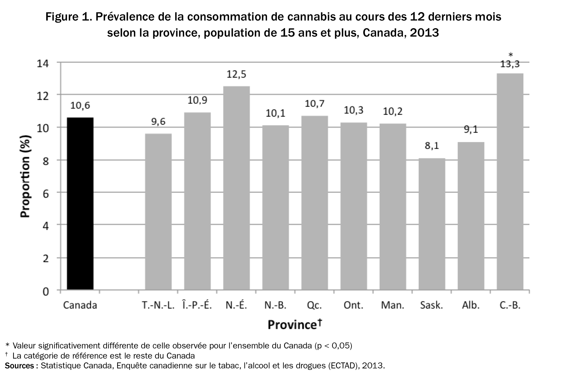 Au Canada en 2013, la consommation de cannabis au cours de la dernière année varie d’une province à l’autre. Les répondants de la Saskatchewan (8,1 %) rapportent une consommation plus basse que la moyenne canadienne (10,6 %), tandis que ceux de la Colombie-Britannique se situent au-dessus de cette moyenne (13,3 %). Dans les deux cas, les taux observés sont statistiquement significatifs. Les taux des autres provinces canadiennes, dont celui du Québec (10,7 %), ne sont pas statistiquement différents du taux moyen canadien (figure 1).
