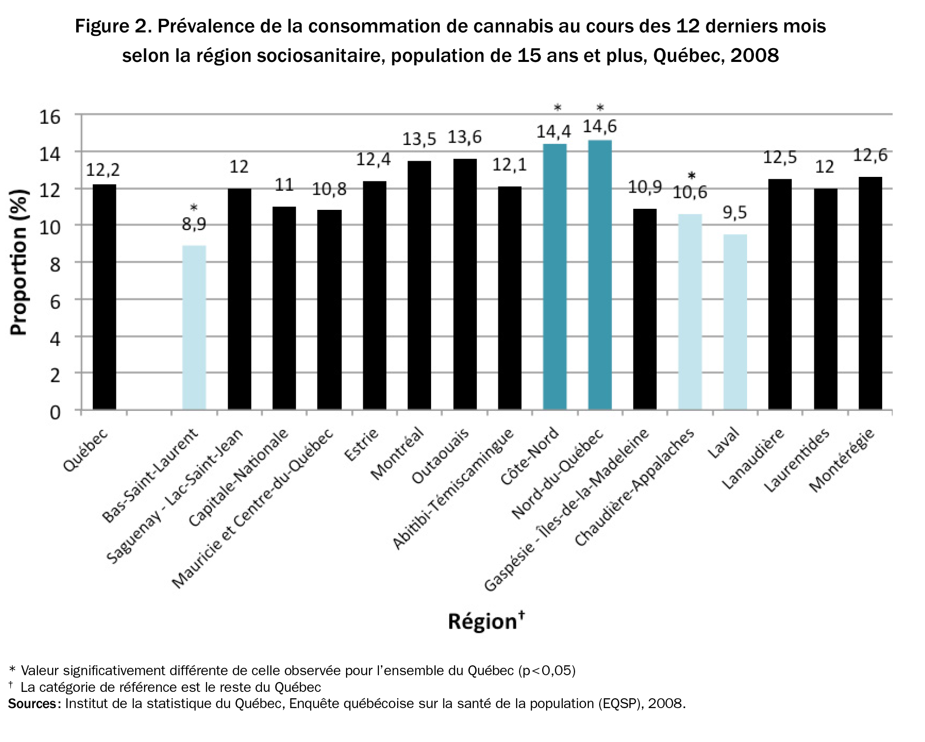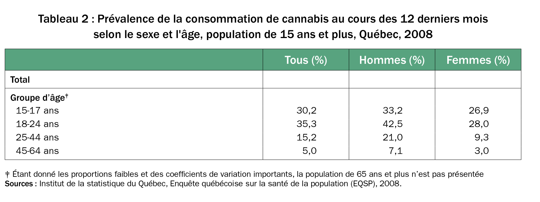 Les données plus spécifiques au Québec sur la consommation de cannabis proviennent de l’EQSP réalisée en 2008. Ces dernières indiquent qu’un peu plus de 12 % des Québécois âgés de 15 ans et plus ont consommé du cannabis au cours de l’année précédant l’enquête. Les adolescents