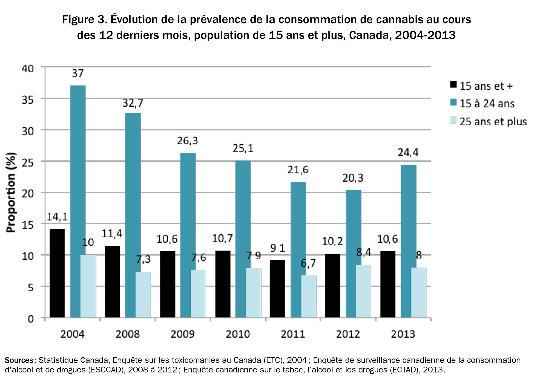 Résultats : En 2013, la prévalence de la consommation de cannabis au cours de la vie chez les Canadiens âgés de 15 ans et plus s’élevait à 33,7 %. Au cours de l’année précédant l’enquête, 10,6 % de la population générale canadienne rapportait avoir fait usage de cannabis. L’enquête de 2008 menée auprès de la population québécoise indiquait que 12 % des Québécois de 15 ans et plus avaient consommé du cannabis au cours de l’année précédente. Les adolescents (15 à 17 ans) et les jeunes adultes (18 à 24 ans) représentaient les groupes où l’on retrouvait la plus grande proportion de consommateurs de cannabis, soit respectivement 30,2 % et 35,3 % d’entre eux. La consommation de cannabis dans la dernière année chez les Canadiens de 15 ans et plus a diminué au cours de la dernière décennie, passant de 14,1 % en 2004 à 10,6 % en 2013. La diminution de la consommation de cannabis est aussi observable chez les jeunes du secondaire au Québec entre 2000 et 2013 avec une baisse de 17,7 %.