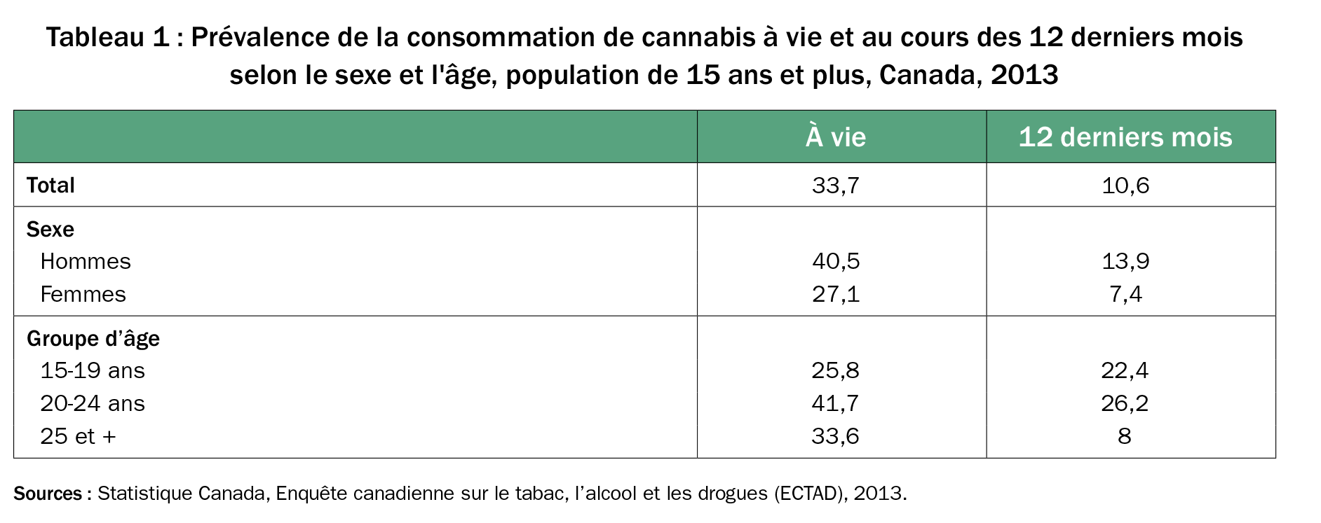 Selon la plus récente enquête canadienne sur le tabac, l’alcool et les drogues (ECTAD) la prévalence de la consommation de cannabis au cours de la vie chez les Canadiens âgés de 15 ans et plus s’élevait à 33,7 % en 2013, soit 40,5 % chez les hommes et 27,1 % chez les femmes (tableau 1). Au cours de l’année précédant l’enquête, 10,6 % de la population générale rapportait avoir fait usage de cannabis, ce qui représente 3,1 millions d’utilisateurs. Cette proportion est comparable à celles observées dans l’Enquête sur la santé dans les collectivités canadiennes – Santé mentale (ESCC-SM) menée en 2012 et dans l’Enquête québécoise sur la santé de la population (EQSP) de 2008 où la proportion d’individus rapportant avoir consommé du cannabis au cours des 12 mois précédents atteignait 12 %.