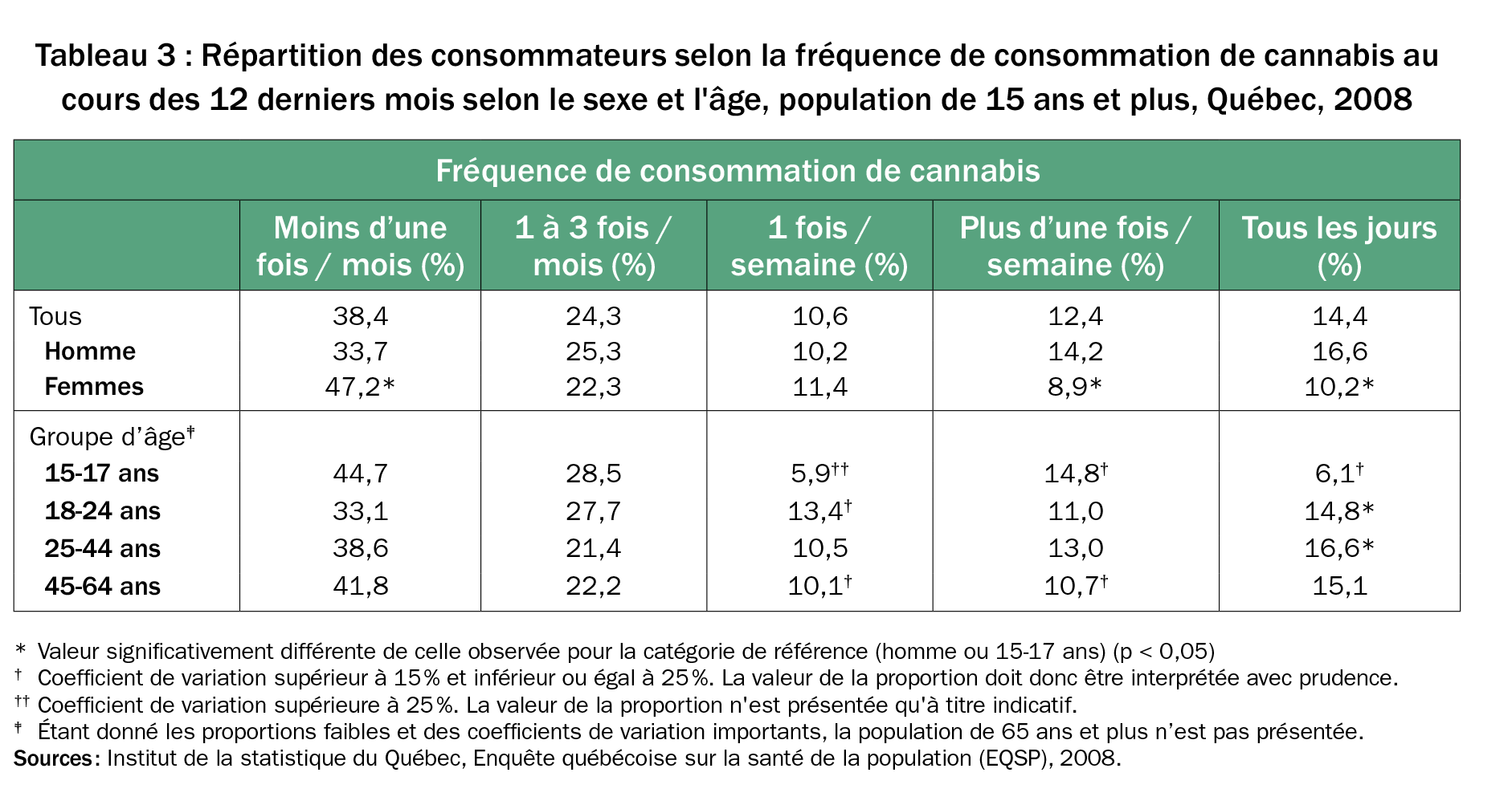 Lorsque l’on considère les mêmes données, mais en fonction de l’âge, on peut observer que parmi les adolescents âgés de 15 à 17 ans qui ont rapporté avoir fait usage de cannabis au cours des 12 derniers mois, 73,2 % d’entre eux en ont consommé moins de trois fois par mois. Par contre, 21 % d’entre eux en consomment plus d’une fois par semaine ou tous les jours (tableau 3). Chez les consommateurs âgés de 18 à 24 ans et de 25 à 44 ans, les données montrent que 15 % et 17 % respectivement de ces individus rapportent faire usage de cannabis quotidiennement, ce qui est significativement plus élevé que chez les adolescents de 15 à 17 ans (6,1 %).
