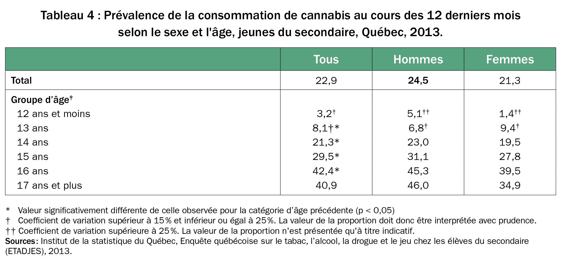 Selon la plus récente Enquête québécoise sur le tabac, l’alcool, la drogue et le jeu chez les élèves du secondaire (ETADJES), près du quart des jeunes du secondaire (22,9 %) ont rapporté avoir consommé du cannabis au cours des 12 derniers mois (tableau 4) (Institut de la statistique du Québec, 2013). La proportion de consommateurs augmente de façon importante avec l’âge passant de 3,2 % chez les 12 ans et moins à plus de 40 % vers l’âge de 16 ans. Les données de l’ETADJES sur la répartition des élèves du secondaire qui ont fait usage de cannabis au cours des 12 derniers mois montrent également que 42 % d’entre eux ont rapporté une consommation inférieure ou égale à une fois par mois alors que 34 % ont déclaré un usage régulier, voire quotidien (non illustré).