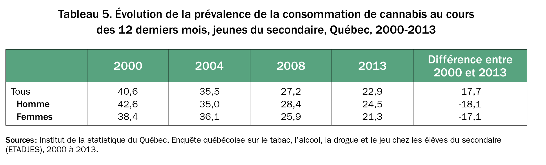 Les données de l’ETADJES, enquête réalisée entre 2000 et 2013 auprès des élèves du secondaire au Québec, indiquent aussi une diminution importante de la consommation au cours des 12 mois précédant l’enquête, et ce, depuis le début des années 2000 (tableau 5). Globalement, la proportion de consommateurs de cannabis chez les jeunes du secondaire au Québec est passée de 41 % à 23 %. En 2013, les filles et les gars sont proportionnellement moins nombreux à rapporter l’usage de cannabis au cours des 12 mois précédant l’enquête qu’en 2000.
