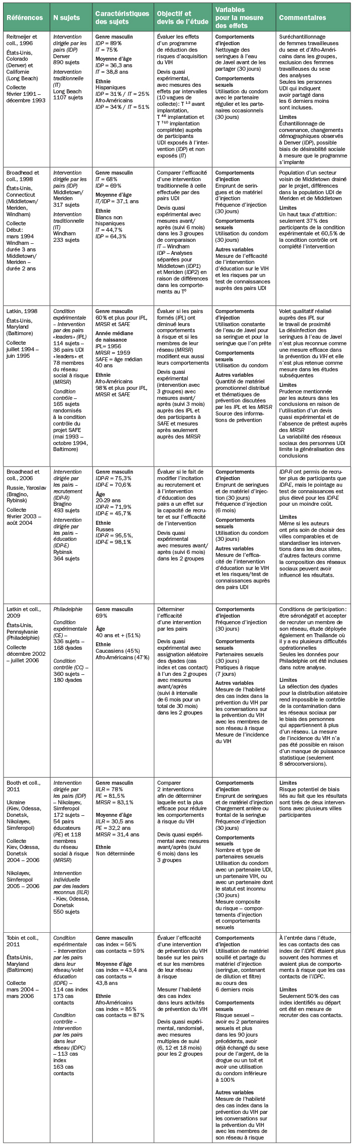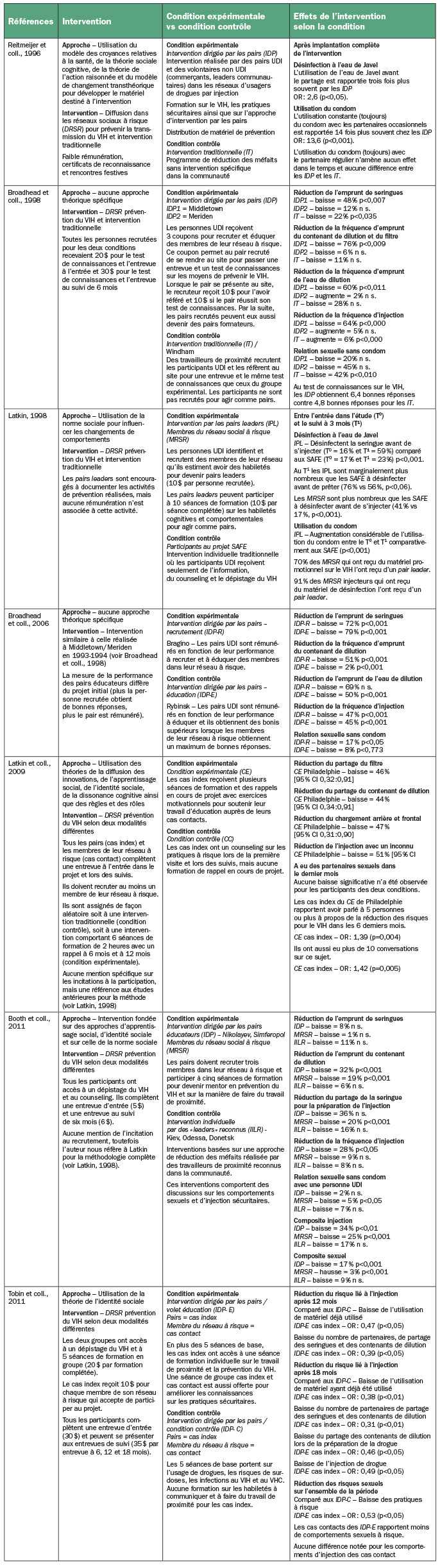 Toutes les interventions comportaient un volet de diffusion de l’information auprès des membres du réseau à risque des pairs UDI sélectionnés pour les activités de prévention, soit les partenaires d’injection et les partenaires sexuels (tableau 2). Dans l’ensemble des interventions, les pairs UDI recevaient une formation sur la prévention du VIH et ils avaient pour tâches de recruter et d’éduquer les membres de leur réseau à risque en vue de réduire les comportements non sécuritaires en lien avec le VIH. La distribution de matériel promotionnel ou de matériel stérile d’injection (4 études) et l’offre de dépistage du VIH avec counseling et éducation par du personnel de santé (4 études) ont aussi fait partie de certaines interventions. Des approches théoriques telles que la diffusion des innovations, et les théories de l’apprentissage social, de l’identité sociale, de la dissonance cognitive ainsi que des règles et des rôles ont été utilisées en combinaison avec une approche des réseaux sociaux dans cinq des sept études. Les interventions, les approches utilisées, les groupes de comparaison ainsi que les effets observés sont décrits dans le tableau 2.